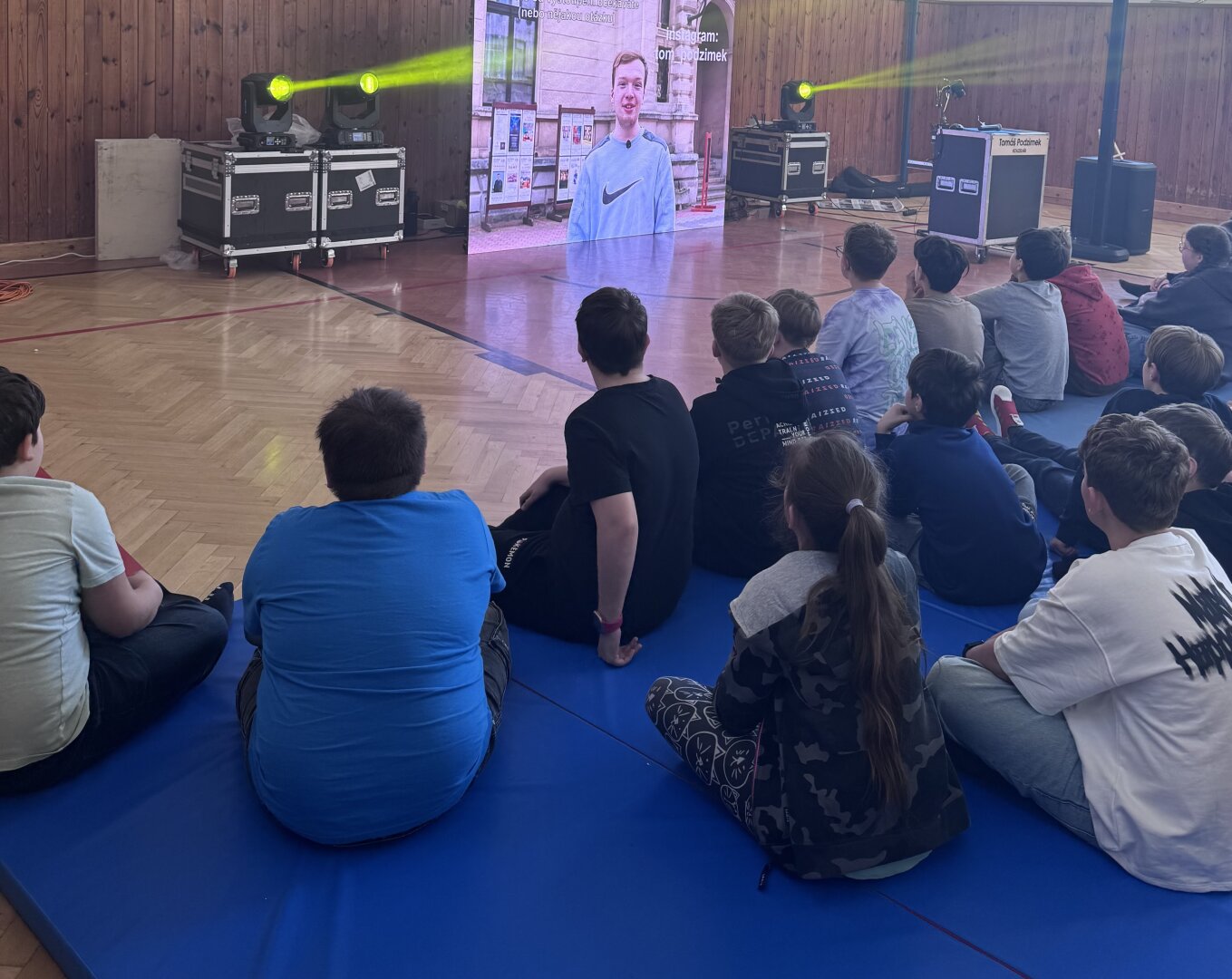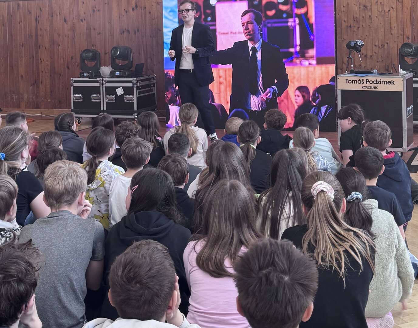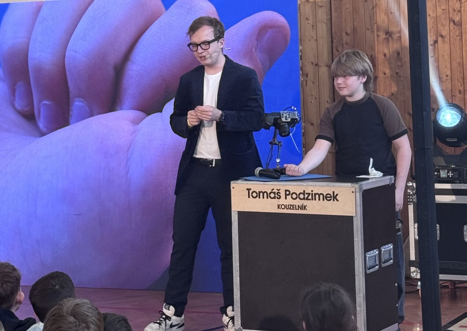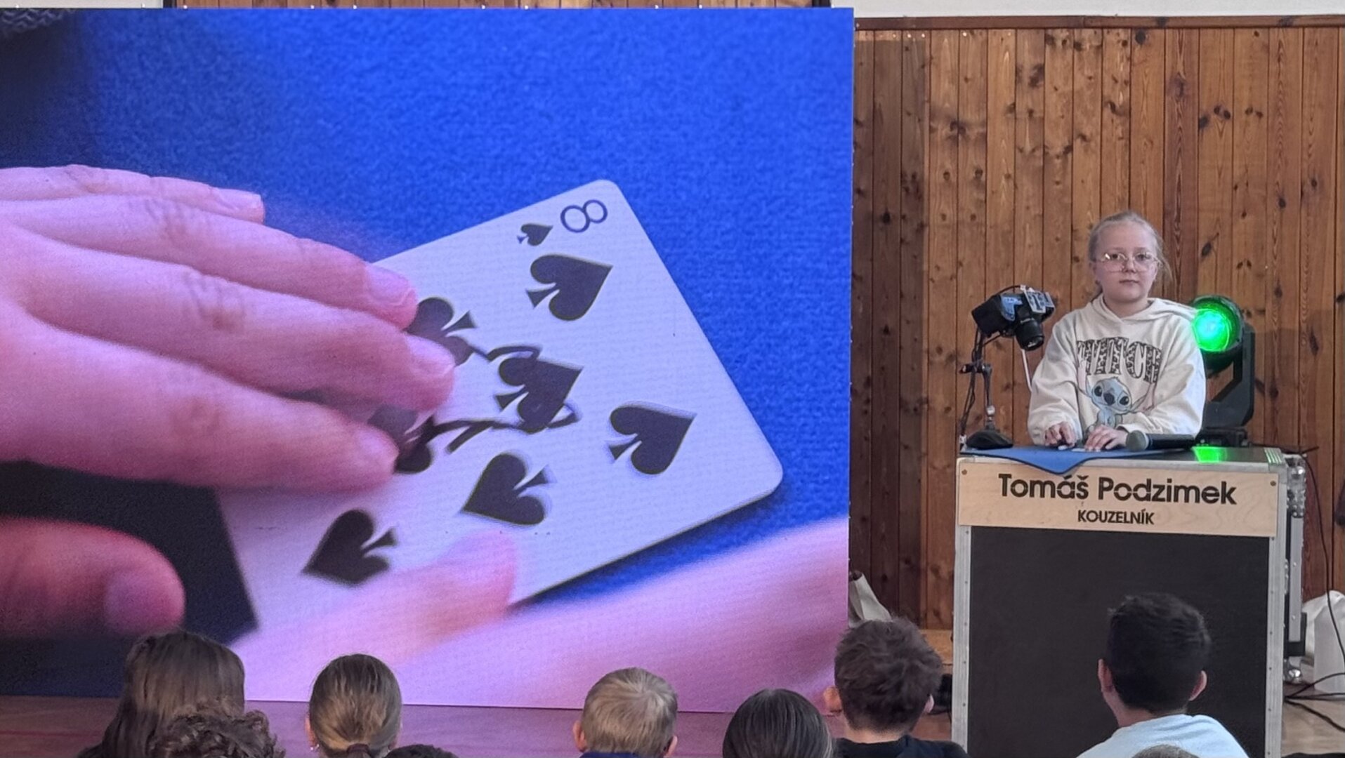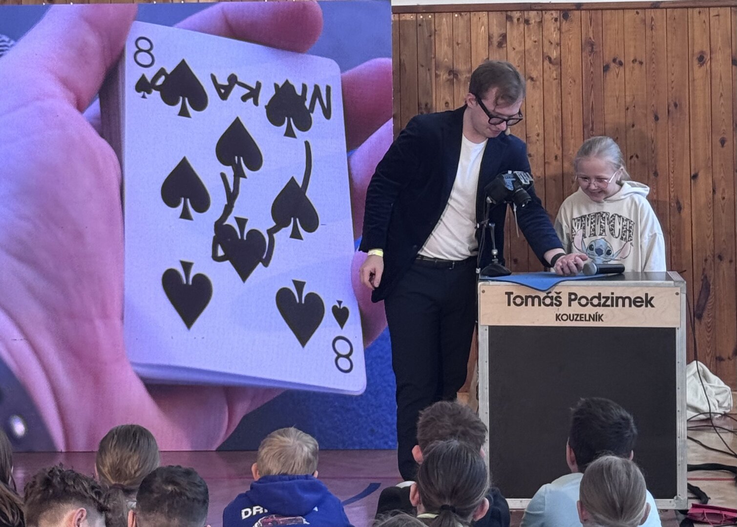 Dnes se naše škola proměnila v místo plné kouzel a zábavy. Navštívil nás kouzelník Tomáš Podzimek se svým programem „Magie kolem světa“. Během vystoupení nás zavedl do různých koutů planety a předvedl triky inspirované různými kulturami. Viděli jsme hlavně kouzla s kartami, šikovné manipulace s předměty a také čísla, do kterých se zapojili někteří žáci z publika. Atmosféra byla po celou dobu velmi veselá a plná smíchu. Celé vystoupení bylo zábavné a zároveň nám ukázalo, kolik tréninku a soustředění je za každým kouzlem. Návštěva kouzelníka Tomáše Podzimka byla příjemným zpestřením našeho školního dne.
