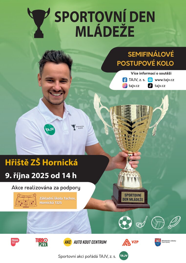 Ve čtvrtek 9. října proběhne na naší škole sportovní odpoledne pod vedením TAJV. Týká se dětí z 1. stupně, kdy si mohou vyzkoušet různé sporty a také si zasoutěžit. Sportovní odpoledne proběhne od 14 do 16 hodin.